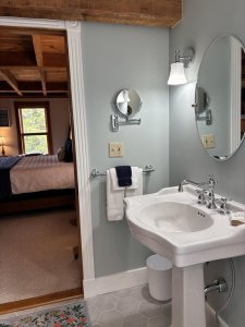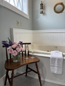 This second-floor Carriage House room has views of Penobscot Bay. Accented by the Maine hemlock post and beam ceiling, king sized bed and flat screen television furnishes this generous room complete with a spacious private ensuite bath with a shower and Jacuzzi tub. Its captivating character makes for an enchanting choice for longer stays or for those who just want to have space to relax and truly refresh themselves through the coastal ambiance.